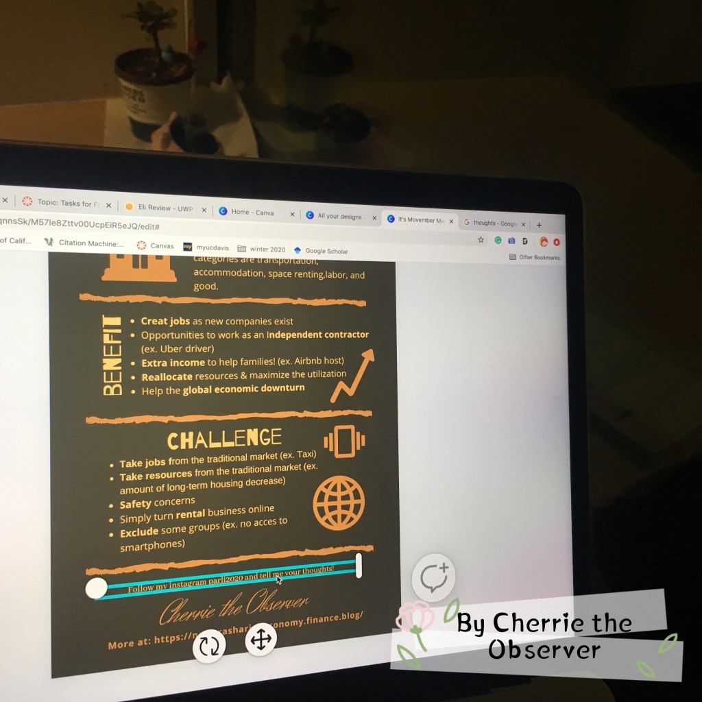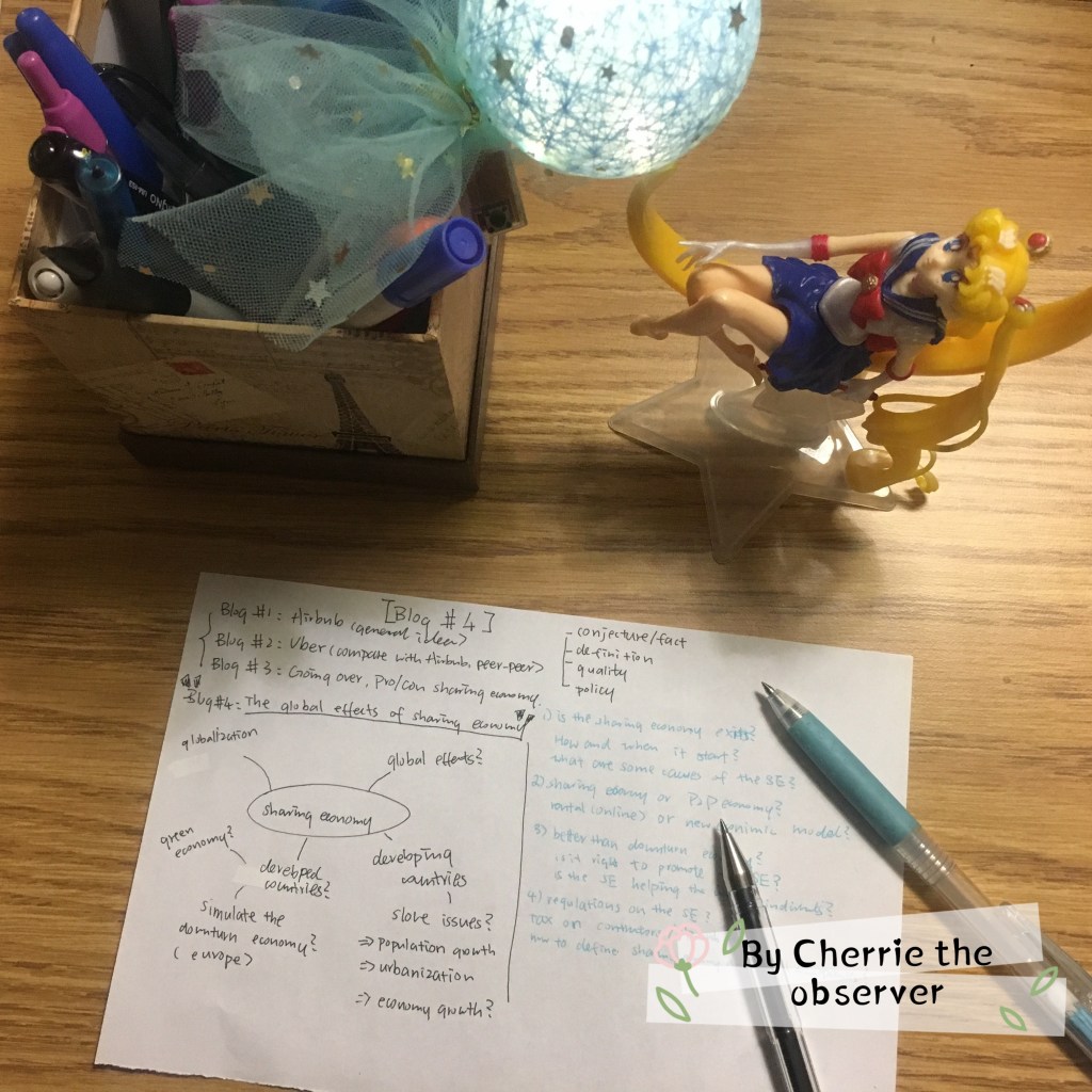 On the first day of choosing a potential topic, I know what to write. I knew that I am interested in the sharing economy but did now have a chance to deep into it. I am a participant in the sharing economy. Then once I chose this topic, I started to do some research. The first two things that I can think of are Airbnb and Uber, thus they became my first two blog posts. I believed that most people are more familiar with these two products comparing to some other sharing economy products such as TaskRabbit or Postmates. Then every time I started to work on a post, I always want to come out with a topic first. However, in the middle of the quarter, I started to do research first because I found that I could not use my prior knowledge to come out with a topic.